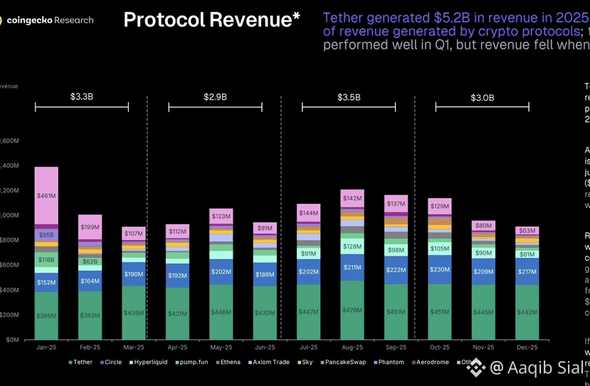While traders obsess over price charts, the real money machine in crypto has been hiding in plain sight. Tether generated a staggering $5.2 BILLION in revenue last year, cementing its position as the most profitable player in the entire industry. Even more shocking? Stablecoin issuers captured 41.9% of total crypto protocol revenue, quietly outperforming DeFi, L1s, and hype-driven narratives.