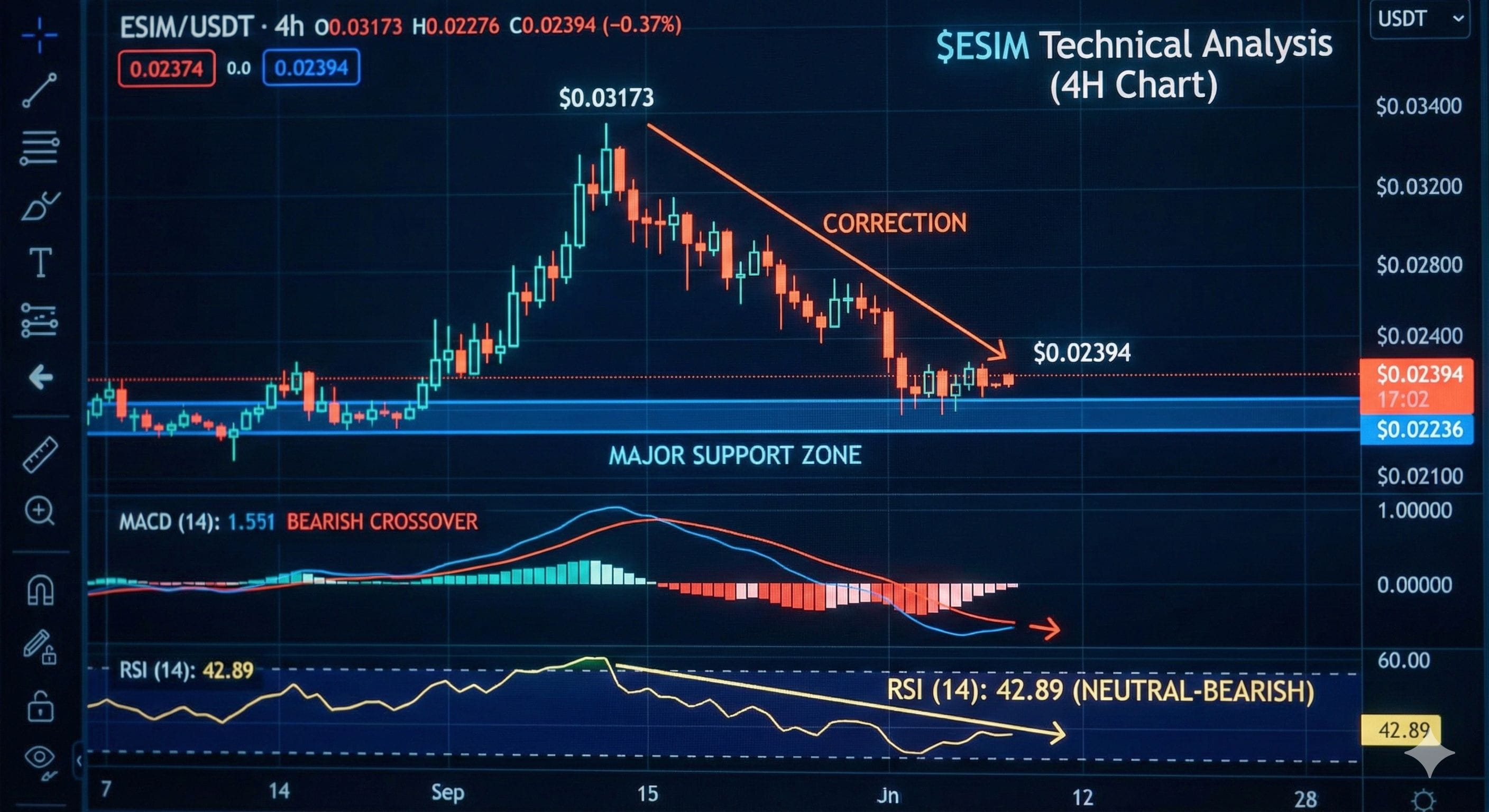 Following a strong rally to a local peak of $0.03173, the $ESIM price is currently undergoing a significant correction on the 4-hour timeframe.