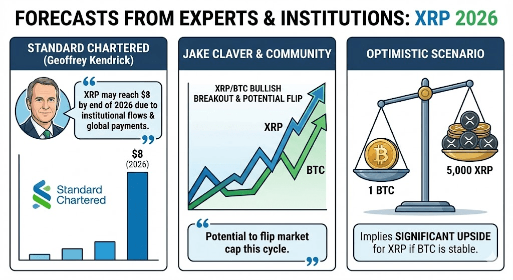 - Standard Chartered (Geoffrey Kendrick): XRP dapat mencapai $8 akhir 2026 berkat aliran dana organisasi dan pembayaran internasional.