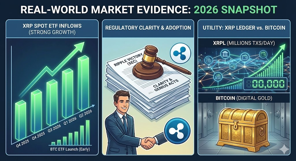 - ETF XRP spot (persetujuan akhir 2025) mencatat aliran kuat, jauh lebih baik dibandingkan fase awal Bitcoin ETF di beberapa indikator.