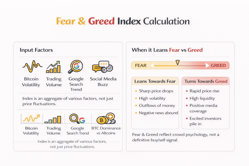 • Khi giá giảm mạnh, biến động tăng cao, dòng tiền rút ra và tin tức tiêu cực xuất hiện dày đặc, chỉ số sẽ nghiêng về Fear. Ngược lại, khi giá tăng nhanh, thanh khoản dồi dào, truyền thông tích cực và nhà đầu tư hưng phấn, chỉ số sẽ tiến dần về Greed.
