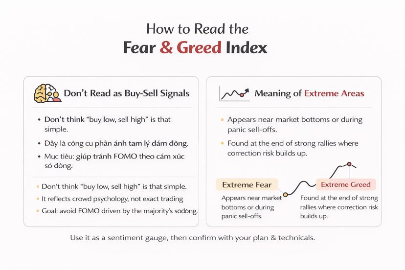 • Mọi người không nên hiểu đơn giản là chỉ số thấp thì mua còn cao thì bán. Thực chất thì đây chỉ là công cụ phản ánh tâm lý đám đông, giúp nhà đầu tư tránh bị FOMO theo cảm xúc số đông.