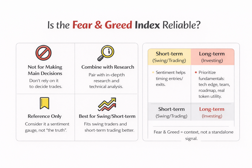 • Những ai đầu tư dài hạn thì nên ưu tiên các chỉ số như nền tảng lợi thế về công nghệ, đội ngũ phát triển ra sao, lộ trình của dự án và ứng dụng thực tế của Token. Chỉ số Fear & Greed chỉ phù hợp với nhà giao dịch Swing và giao dịch ngắn hạn