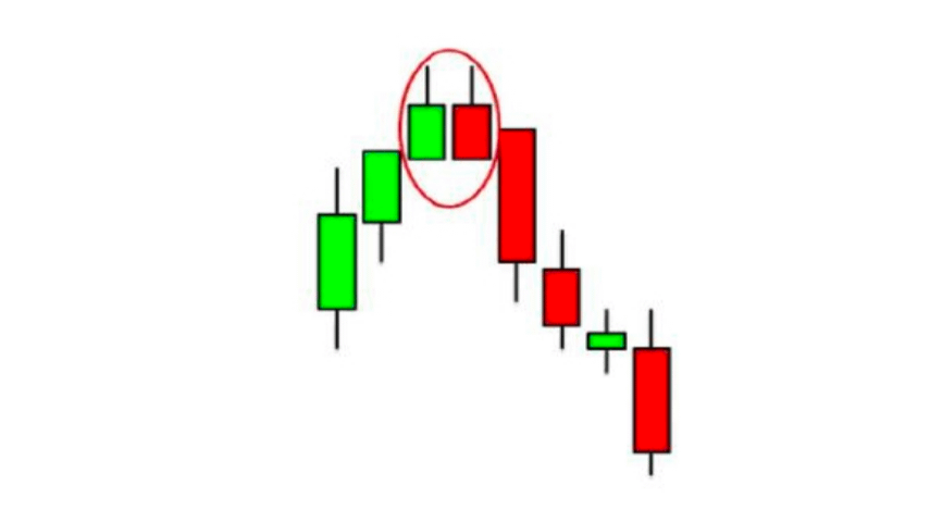 Candle pertama adalah bullish (hijau) dan yang kedua adalah bearish (merah). Ini selalu terbentuk di puncak tren naik yang panjang di grafik. Candle pertama dalam pola ini bisa berupa candle bullish panjang, candle bullish kecil, atau candle bullish tunggal. Candle kedua juga bisa berupa candle bearish panjang, candle bearish kecil, atau candle bearish tunggal.