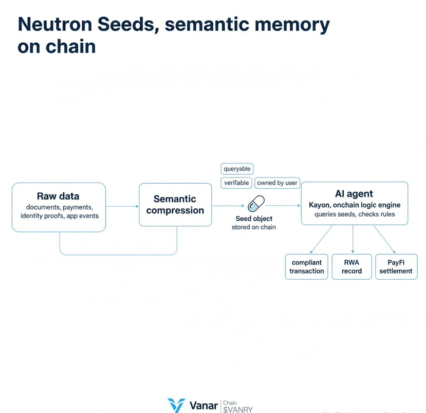 Neutron adalah apa yang mereka sebut lapisan memori semantik mereka, dan ini memecahkan masalah yang sebagian besar orang tidak bahkan menyadari ada. Blockchain tradisional menyimpan pointer ke file yang berada di tempat lain, biasanya IPFS atau penyimpanan terpusat. Jika penyimpanan eksternal itu mati, data Anda menghilang meskipun catatan blockchain tetap ada. Neutron menyimpan file-file nyata langsung di rantai menggunakan kompresi yang didorong oleh AI yang mengecilkan hingga 500 kali ukuran aslinya. Ini bukan sekadar file yang terkompresi. Ini adalah apa yang disebut Vanar sebagai Seeds, yaitu objek data cerdas yang memahami strukturnya sendiri dan dapat ditanyakan oleh kontrak pintar.