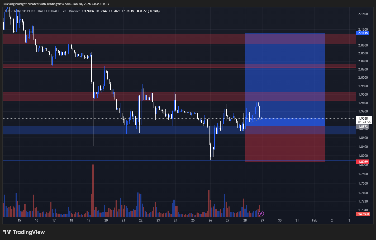 Selama 1.88–1.90 bertahan, likuiditas naik di atas 2.10 menjadi magnet.