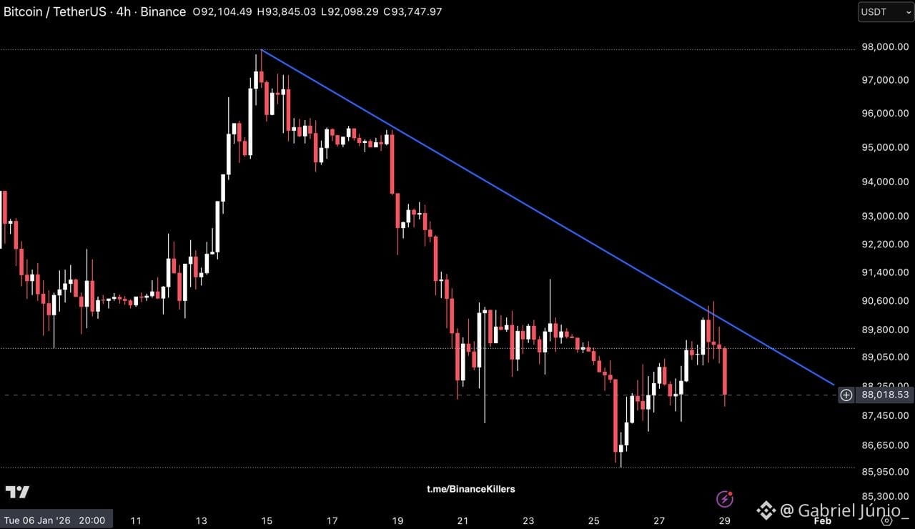 O $BTC continua respeitando a linha de tendência descendente, com o preço rejeitando novamente a zona de US$ 89,5K–US$ 90K, um nível que anteriormente atuou como resistência. O movimento recente confirma que os vendedores ainda estão defendendo essa estrutura.