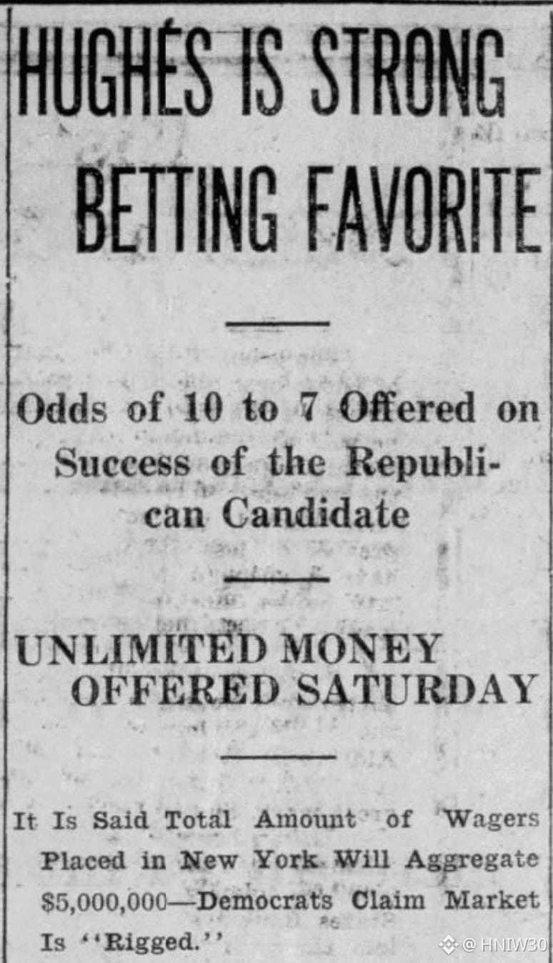 In the 1916 presidential election, Charles Evans Hughes led Woodrow Wilson in the New York betting market. It's noteworthy that the betting market was frequently covered by the news media in American politics at that time. Because of this coverage, the shadow of market manipulation lingered. In 1916, Democrats, not wanting to be seen as lagging behind, claimed the betting market was "rigged," and the media reported on this