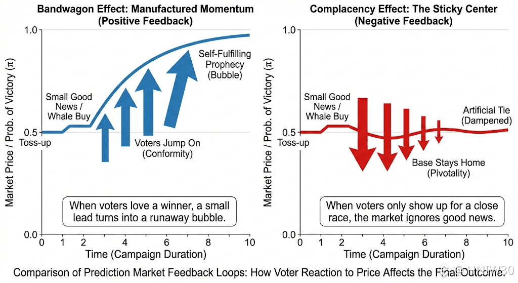 If popularity helps a candidate gain more support, then broadcasting market prediction prices in the news creates an incentive to inflate those prices. Manipulators might try to boost the odds of their preferred candidate, hoping to trigger a feedback loop: market prices rise → voters perceive the momentum → voters shift their support → prices rise again.