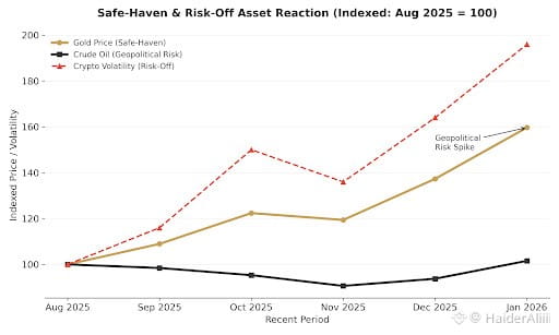 This chart illustrates the recent performance of gold and crude oil alongside cryptocurrency market volatility. As geopolitical risks spiked in late 2025 and early 2026, gold surged to record highs above \$5,300 per ounce, acting as a primary safe-haven. Crude oil saw a corresponding uptick due to supply concerns in the Middle East, while crypto volatility spiked sharply, reflecting a rotation out of riskier digital assets into traditional stores of value.