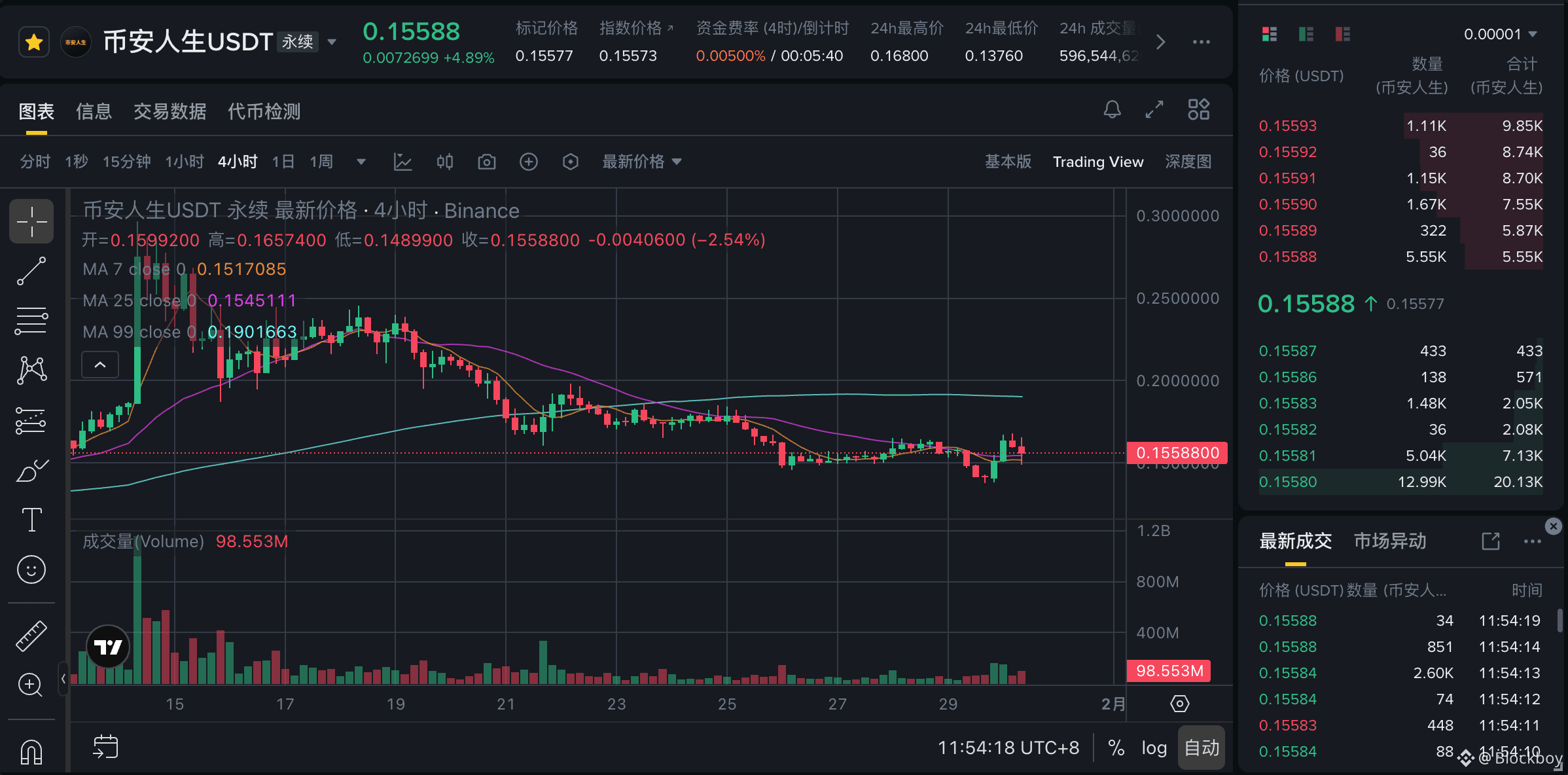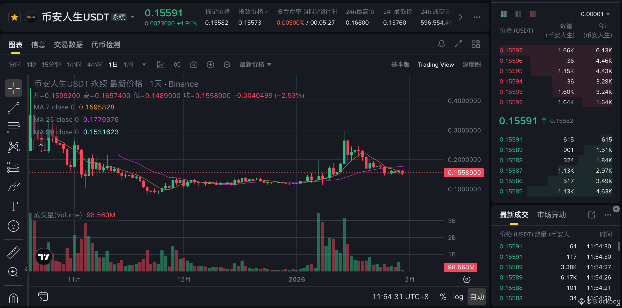 基于4小时K线图、日线图、全网爆仓数据以及BTC大盘走势,结合当前0.005%的资金费率,以下是关于 $币安人生 (以下简称该代币) 的走势分析。