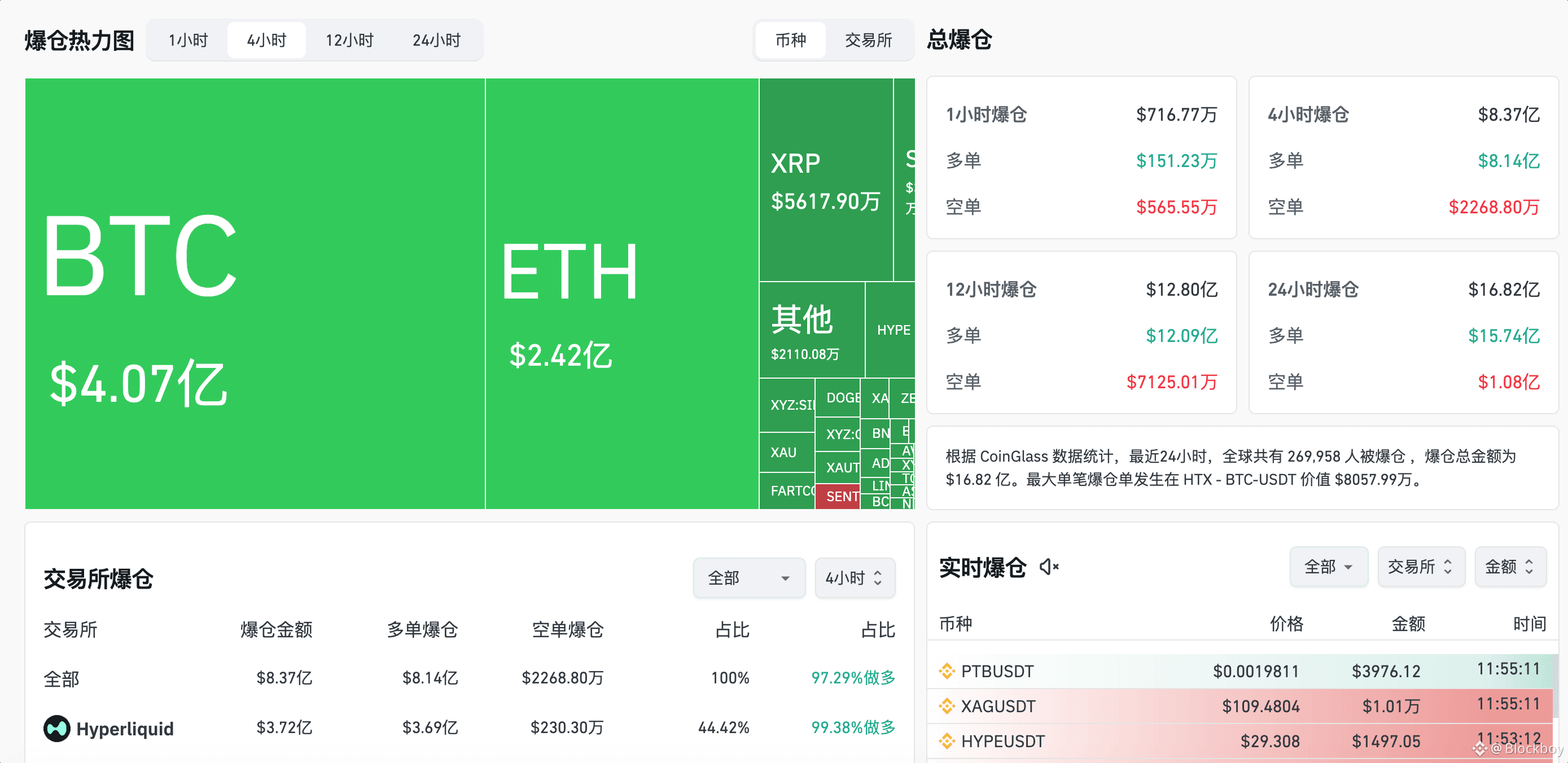 大盘的极端恐慌传导:从爆仓热力图可见,全网4小时内爆仓金额高达8.37亿美元,其中多单爆仓8.14亿美元,占比高达97.29%。BTC单日暴跌超6%,击穿83,000美元关口。在如此极端的“多头屠杀”行情下,绝大多数山寨币(Altcoins)通常会跟随大盘出现10%-20%的跌幅。