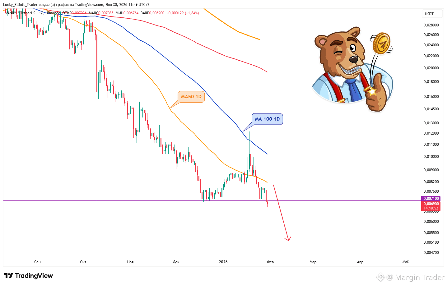 Сейчас $VANRY находится на локальном дне и тренд остаётся падающим. Цена закрепилась ниже дневных МА50 и МА100 - это явный признак слабости. Обратите внимание на огромную тень дневной свечи от 10.10.2025. Такие тени возникают при остром дефиците ликвидности. При пробое текущего дна мы можем увидеть аналогичную ситуацию.