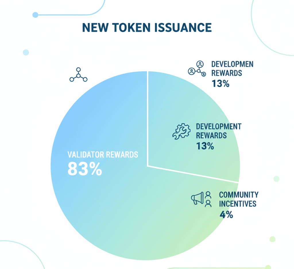 Sebagian besar pasokan baru—83%—didedikasikan untuk imbalan validator. Alokasi ini mencerminkan model ekonomi yang mengutamakan validator, memastikan bahwa keamanan jaringan, waktu aktif, dan desentralisasi terus diinsentifkan seiring meningkatnya aktivitas di rantai.