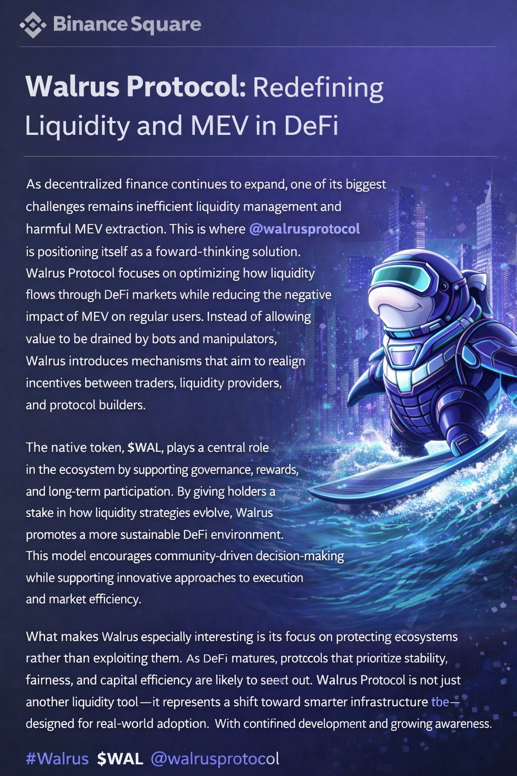 $WAL keuangan terdesentralisasi terus berkembang, salah satu tantangan terbesarnya tetap pada pengelolaan likuiditas yang tidak efisien dan ekstraksi MEV yang merugikan. Di sinilah @walrusprotocol memposisikan diri sebagai solusi yang berpikir ke depan. Walrus Protocol berfokus pada pengoptimalan aliran likuiditas melalui pasar DeFi sambil mengurangi dampak negatif MEV pada pengguna biasa. Alih-alih membiarkan nilai dikuras oleh bot dan manipulator, Walrus memperkenalkan mekanisme yang bertujuan untuk menyelaraskan kembali insentif antara trader, penyedia likuiditas, dan pembangun protokol.