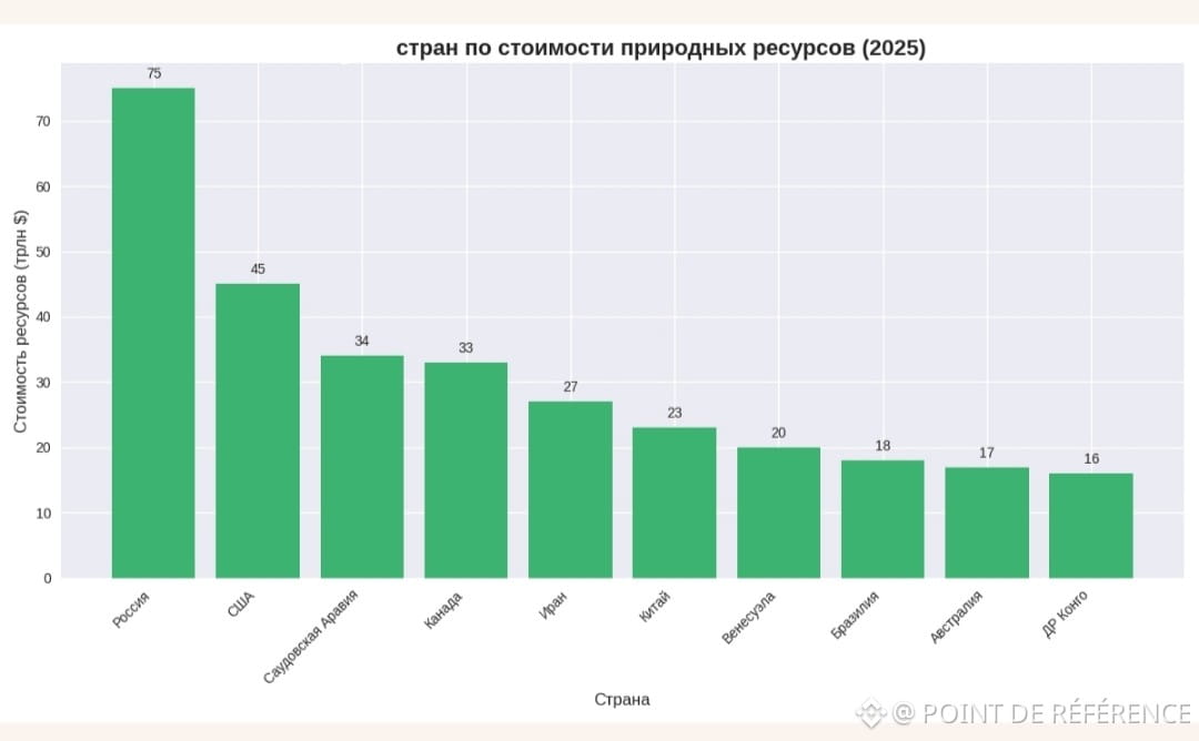 На 2025 год крупнейшие запасы природных ресурсов сосредоточены в России (≈75 трлн $), далее следуют США (≈45 трлн $), Саудовская Аравия (≈34 трлн $), Канада (≈33 трлн $), Иран (≈27 трлн $). Эти страны формируют ядро мирового влияния на рынки нефти, газа, угля, золота и алмазов.