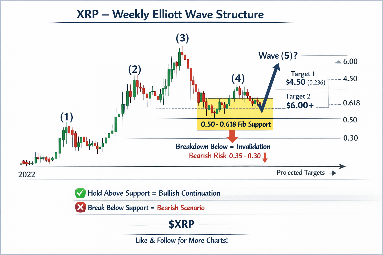 Namun, penembusan decisif di bawah dukungan kunci ini akan membatalkan hitungan saat ini, menunjukkan Gelombang (4) mungkin akan membentang ke dalam koreksi yang lebih dalam, dengan risiko penurunan hingga 0,35–0,30.