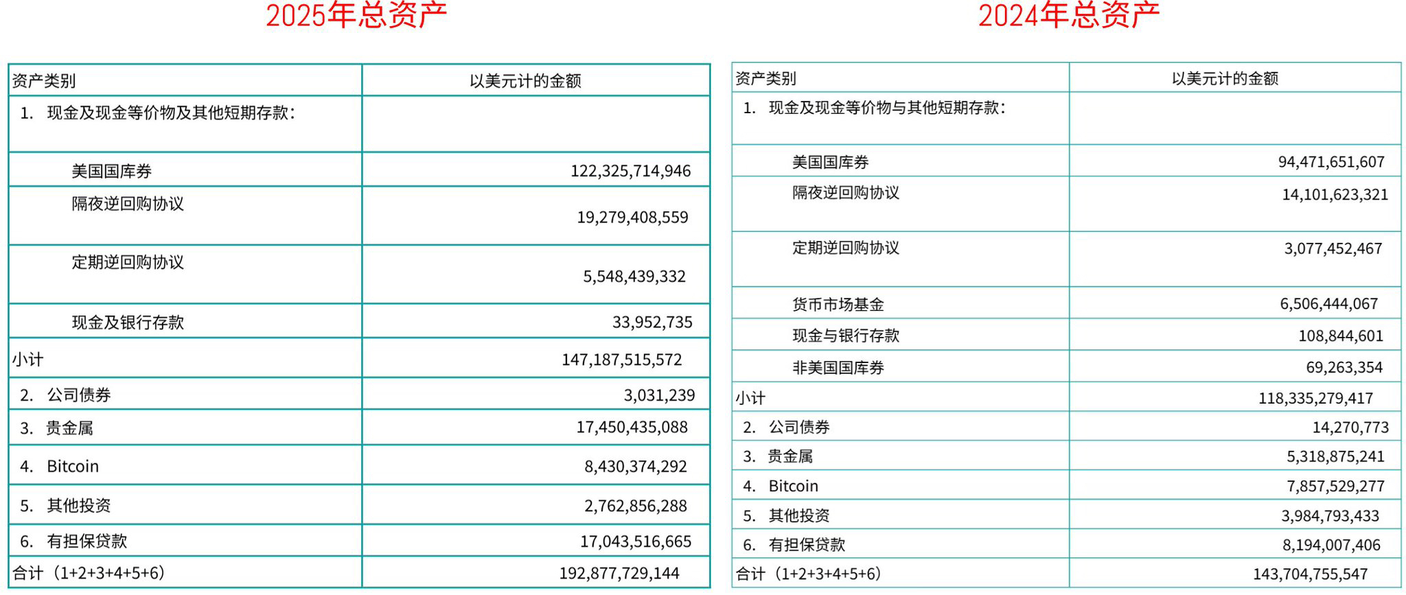 Selain itu, yang lebih penting adalah bahwa pada tahun 2025 dibandingkan dengan tahun 2024, proporsi aset stabil Tether (obligasi AS, kas, dll.) turun dari 82,35% menjadi 76,31%, sedangkan proporsi aset non-stabil (logam mulia, Bitcoin, dll.) meningkat dari 17,65% menjadi 23,69%.