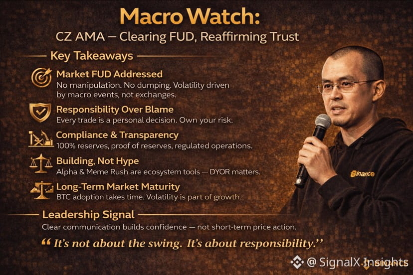 CZ menjelaskan bahwa kebangkrutan pada 10 Oktober dipicu oleh pengumuman tarif makro — bukan Binance. Ukuran Bitcoin (~$2T kapitalisasi pasar) membuat manipulasi oleh entitas tunggal tidak realistis. Penundaan sistem sementara selama lalu lintas puncak telah diselesaikan, dan pengguna yang terkena dampak telah sepenuhnya dikompensasi.