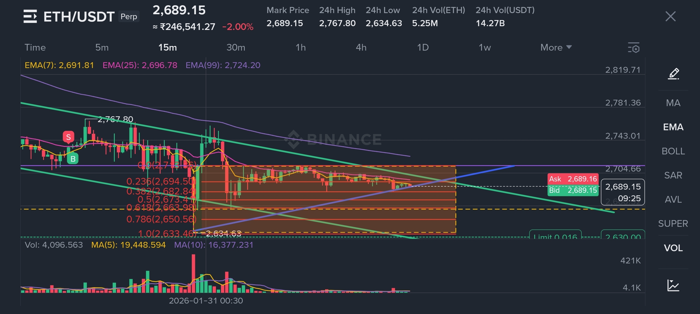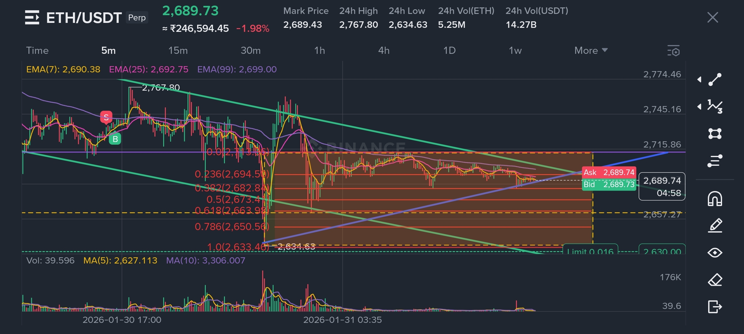 EMA7 < EMA25 ≈ EMA99 flattening