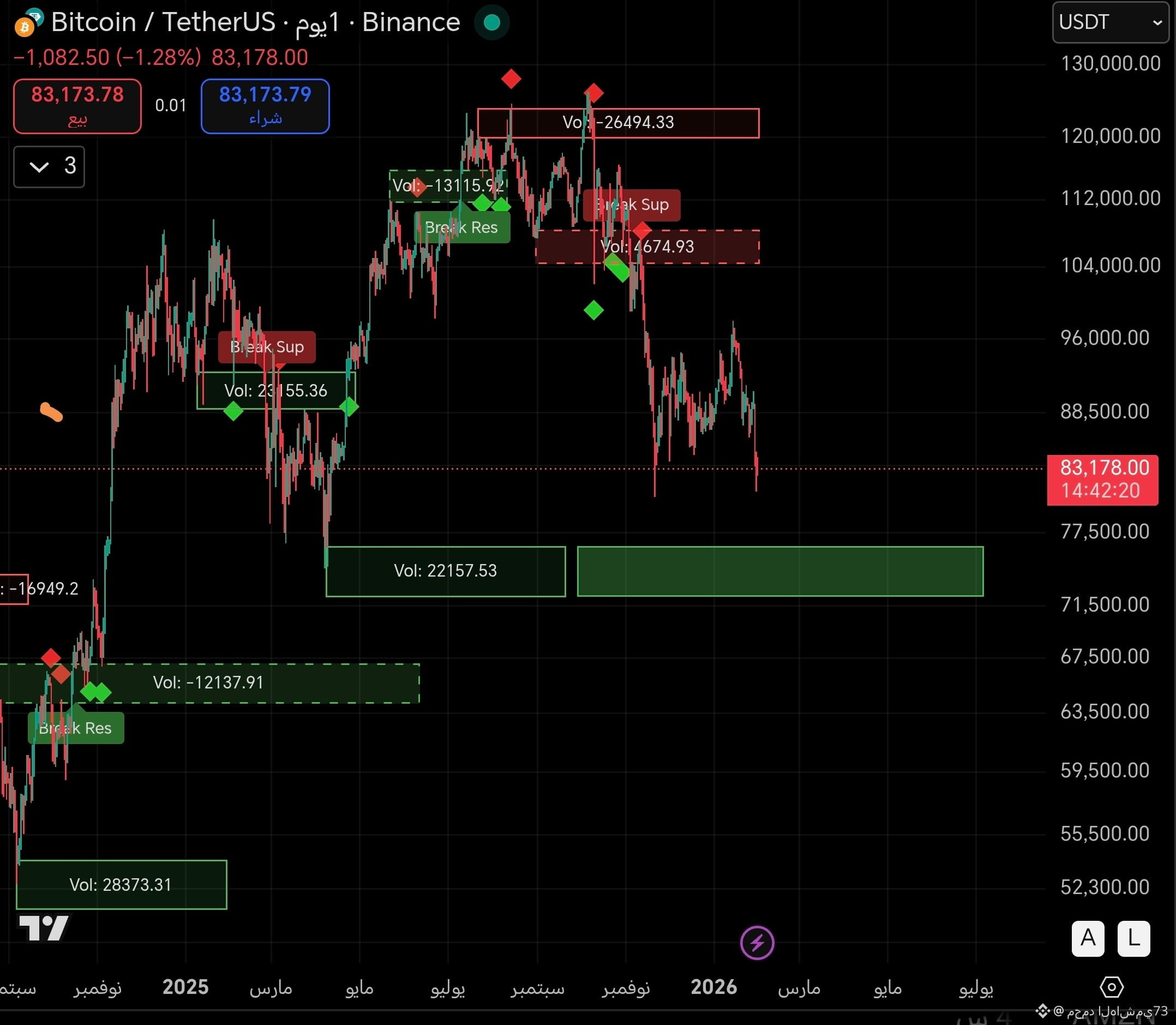 السعر الآن حول 83K = منطقة حيادية بين الدعم والمقاومة.