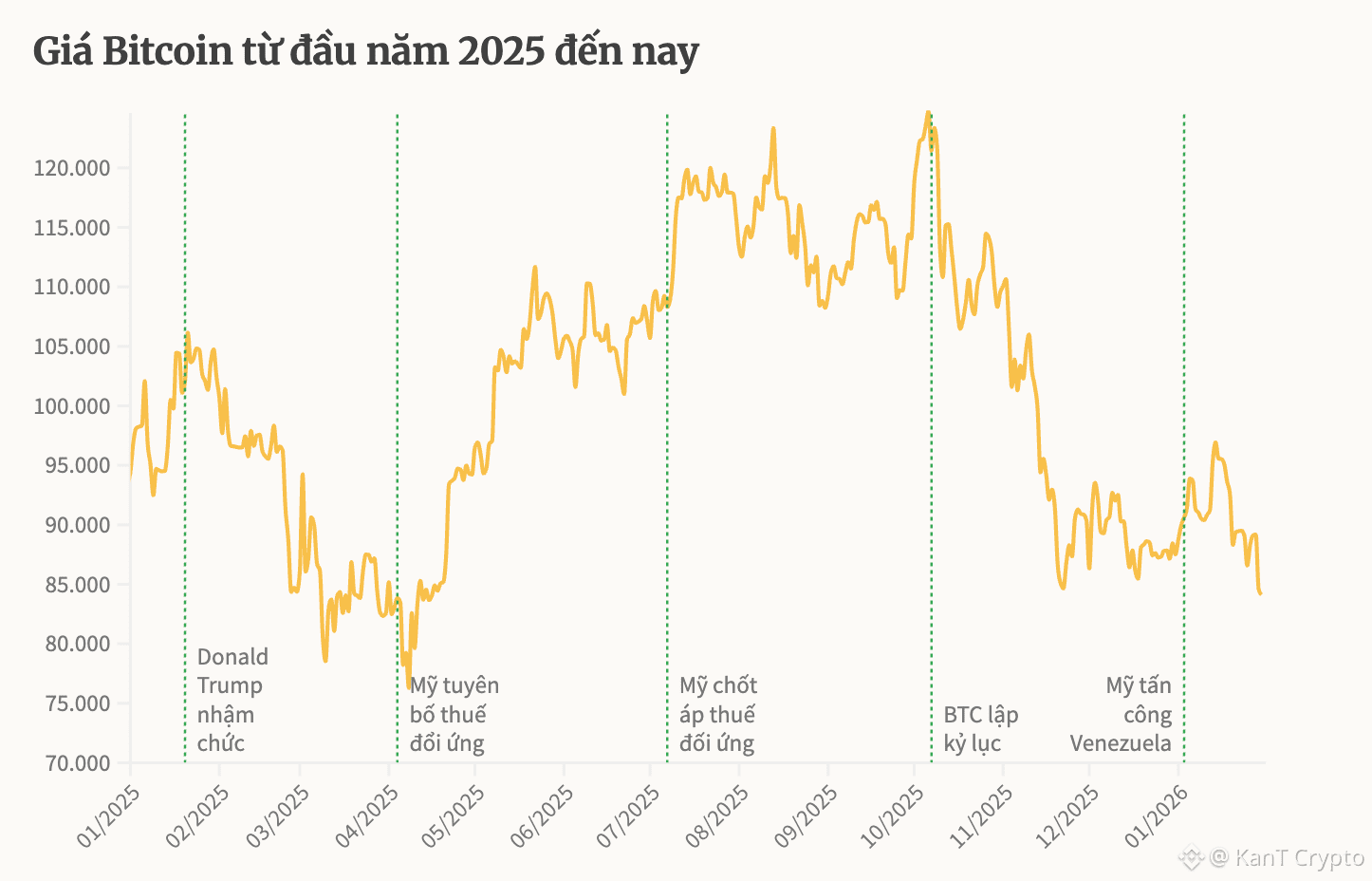 Từ giữa tháng 11/2025 đến nay, BTC mất mốc quan trọng 100.000 USD một đơn vị. Tiền số này sáng nay giao dịch quanh 84.000 USD, phục hồi hơn 2% so với hôm qua. Tuy nhiên nếu so với đỉnh giá 126.198 USD được thiết lập vào đầu tháng 10 năm trước, Bitcoin đang mất giá hơn 33%.
