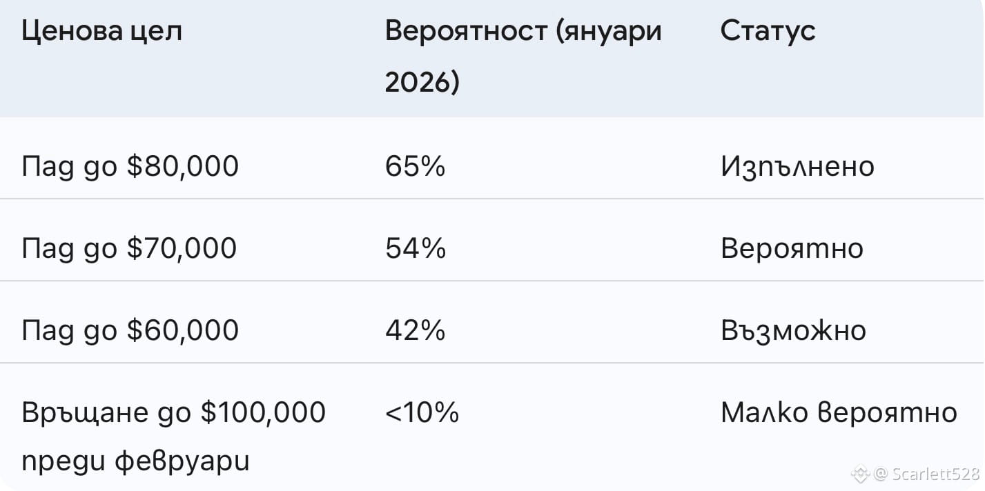 Тези данни показват, че пазарът на прогнози е бил предварително настроен за мечи сценарий, което често се използва като инструмент за самоизпълняващо се пророчество. Когато мнозинството вярва в спада, ликвидността за покупки изчезва, оставяйки пътя на цената надолу напълно отворен.