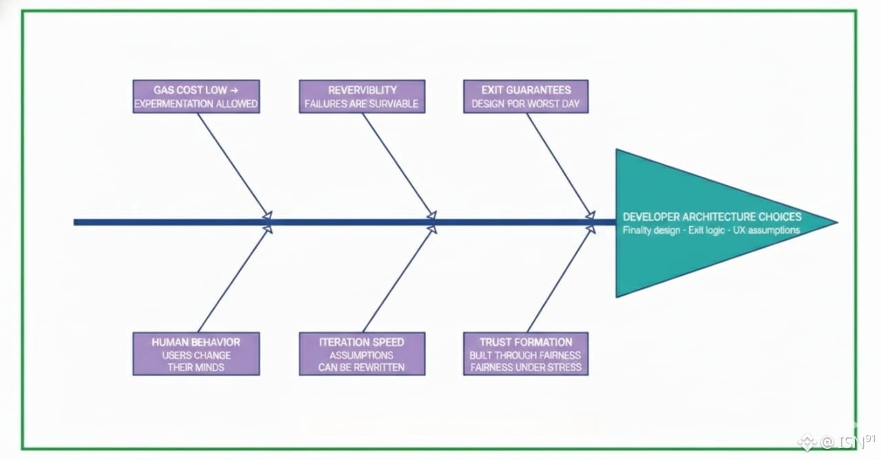Plasma doesn't just move execution off-chain. It changes how developers feel about building. When gas stops punishing curiosity and reversibility is part of the design, architecture becomes less defensive and more honest.
