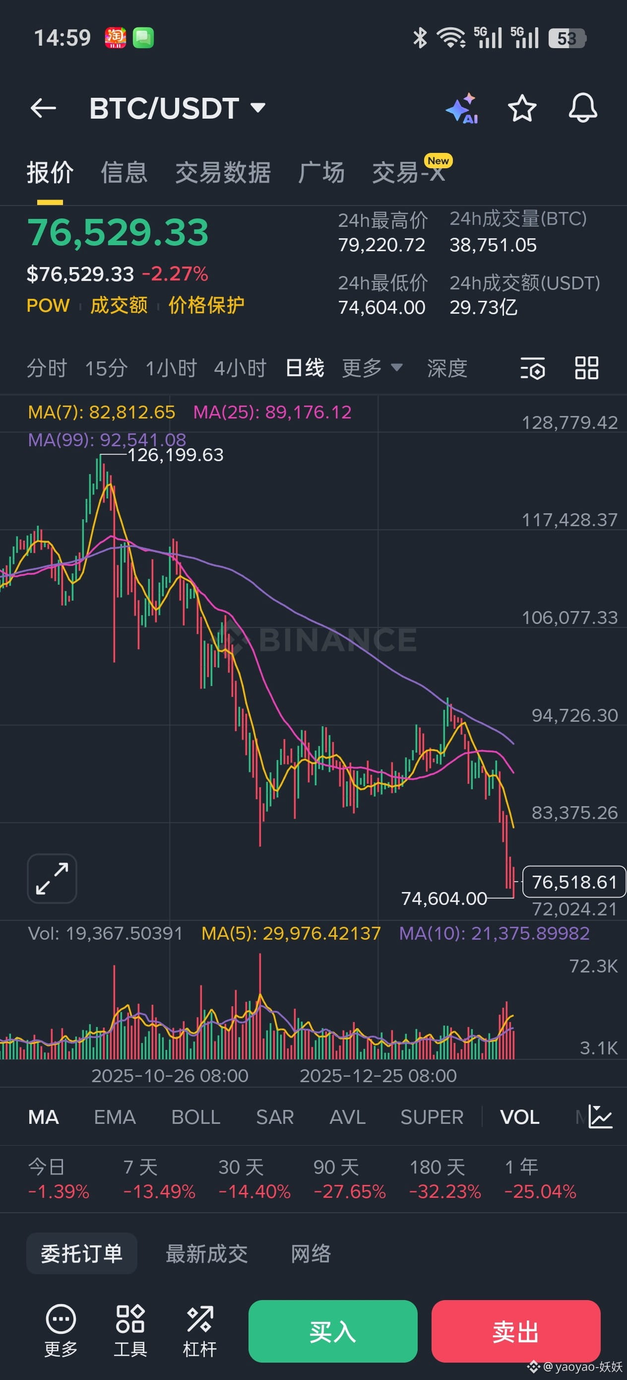 比特币:7万6千刀,24小时跌了2.66%。从图上看,之前最高12万6,现在直接腰斩到7万4,MA5、MA10、MA20全在头顶压着,典型的空头排列。MACD还是绿的,短期别指望V型反转。
