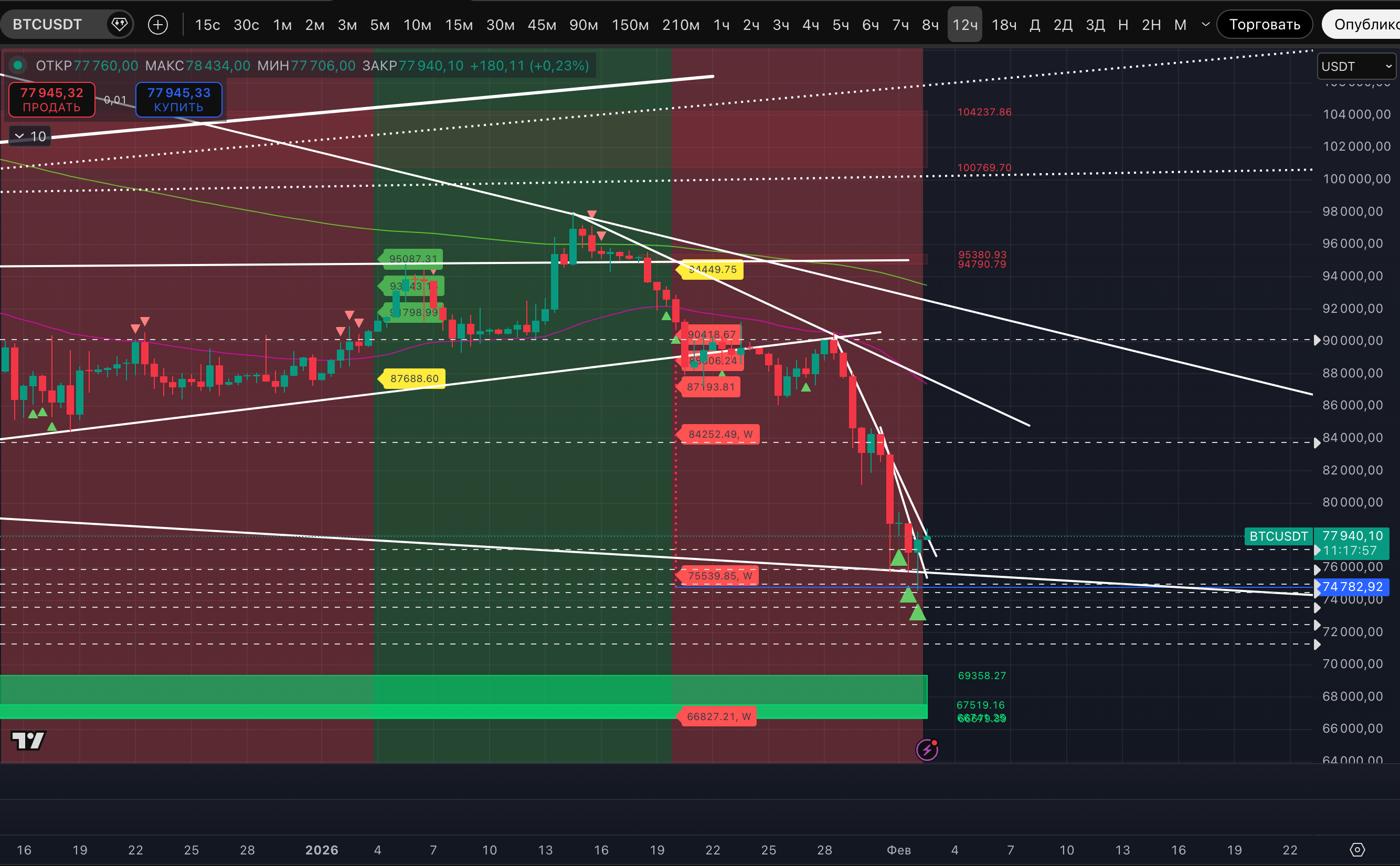 Pertama-tama, dasar dalam penurunan ini telah diperbarui dan sekarang adalah 74 604$. Tujuan penuh "Bearish wedge", yang telah dibicarakan sejak 9 Januari, 74 782$ - telah tercapai. Meskipun saat itu kami tidak menganggap ini mungkin.