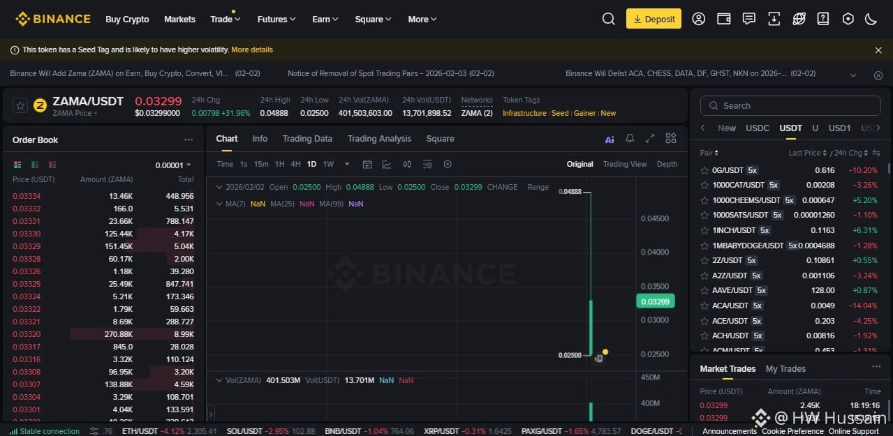 ZAMA carries Binance’s Seed tag, meaning low market cap + thin liquidity.