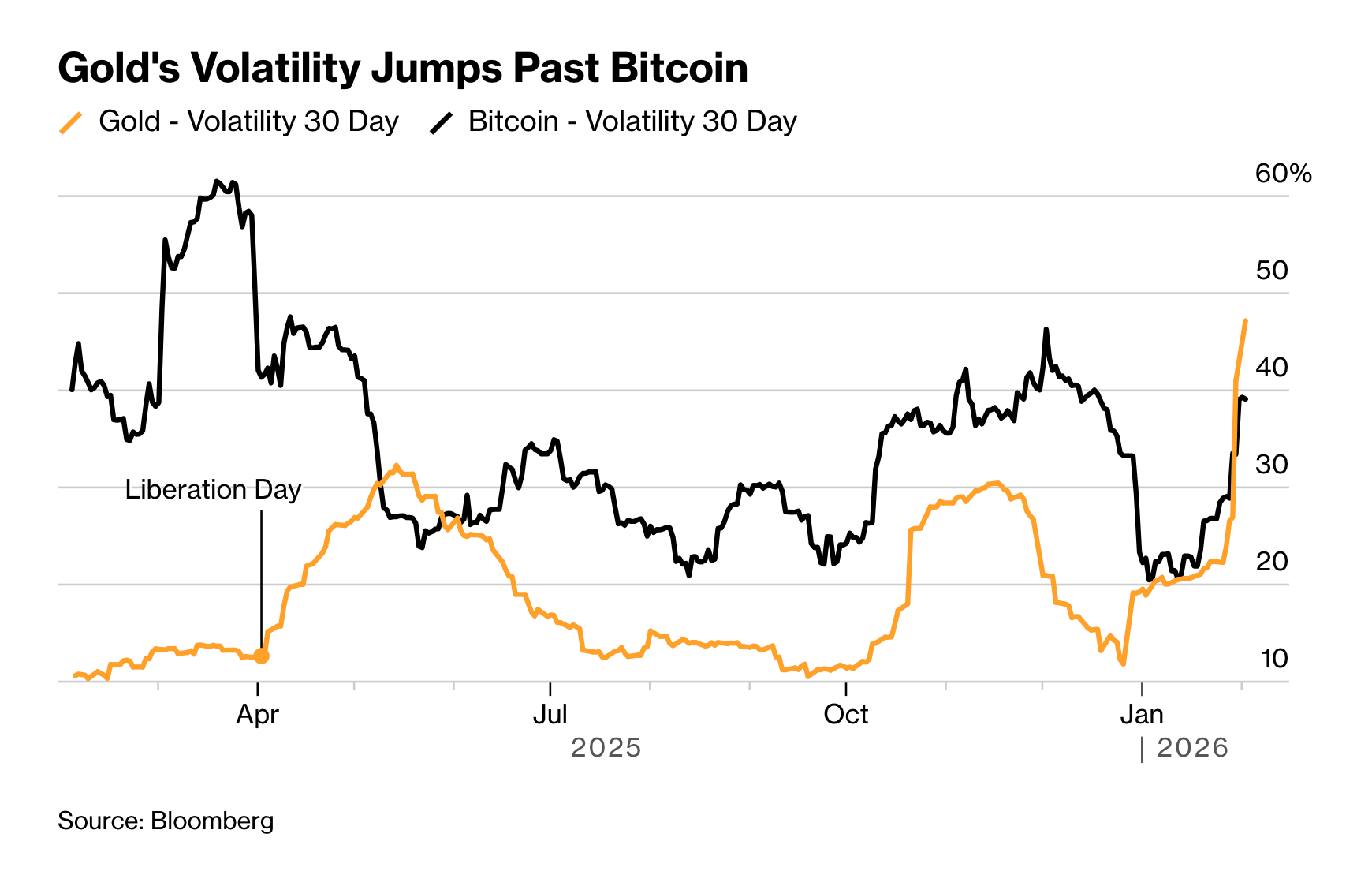 #Bloomberg mencatat bahwa sejak kemunculan BTC, emas hanya lebih volatil dua kali, terakhir kali - pada bulan Mei, di tengah lonjakan ketegangan perdagangan dan ancaman tarif dari Trump.