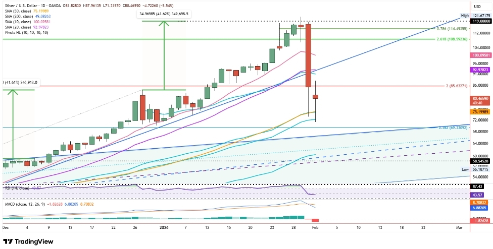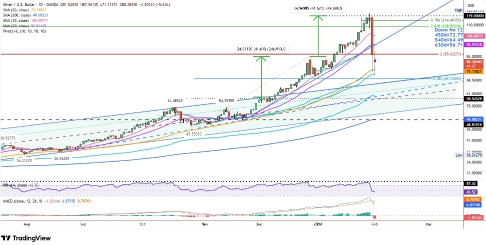 Lilin engulfing mingguan bearish sulit untuk diabaikan. Itu menandai pergeseran kontrol yang jelas, mendorong perak turun ke level terendah tiga minggu dan mengkonfirmasi bahwa kemajuan sebelumnya kemungkinan telah mencapai akhir untuk saat ini. Penjualan lanjutan ke hari Senin memperkuat pandangan itu, dengan harga sementara meluncur ke $71.32.