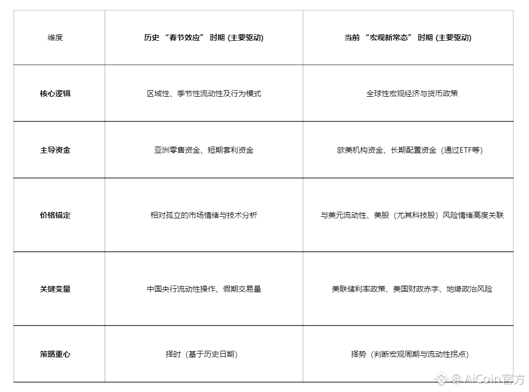 下表概括了驱动比特币市场的核心因素从“春节效应”时期到当前“宏观新常态”的演变: