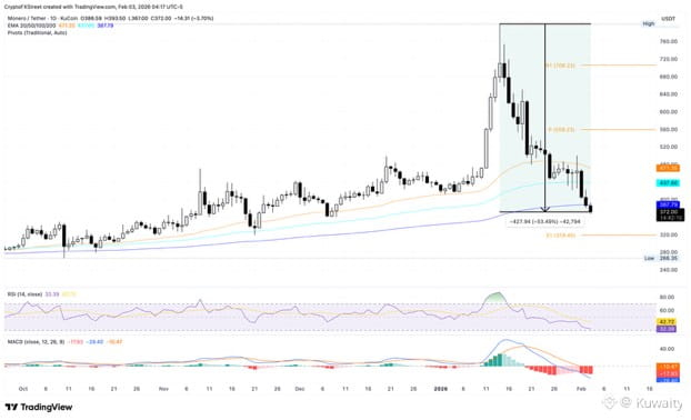 انخفضت مونيرو دون حاجز 400 دولار من ذروتها البالغة 800 دولار في 14 يناير، مما يمثل انخفاضًا يزيد عن 50%. في وقت كتابة هذا التقرير يوم الثلاثاء، انخفضت $XMR بنسبة 4% خلال اليوم، متداولة دون المتوسط المتحرك الأسي لمدة 200 يوم عند 387 دولار، مما يمثل انخفاضًا يقارب 20% على مدار الثلاثة أيام الماضية.