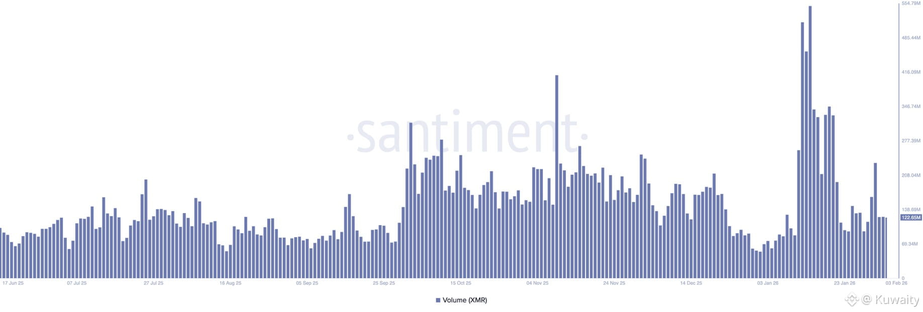 ومع ذلك، تشير بيانات سانتيمنت إلى أن حجم تداول مونيرو يقف عند حوالي 122 مليون دولار يوم الثلاثاء، منخفضًا من ذروة 232 دولار في 31 يناير، مما يشير إلى تراجع ضغوط البيع. عادةً ما تشير الارتفاعات في حجم التداول خلال الاتجاه الهبوطي إلى عمليات بيع، كما لوحظ في 14 و31 يناير.
