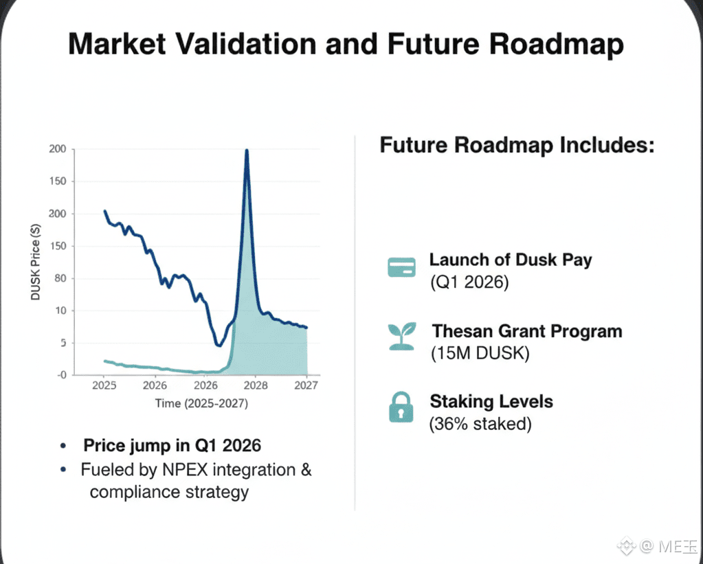 The market has taken notice; in early 2026, the price of DUSK jumped significantly after approximately 1 year of steady decline. This was not only due to speculative activity, but also due to the recent material evolution of NPEX (the integration of the #Dusk platform with NPEX) and the clear strategy that Dusk has adopted with regards to its compliance-first strategy.