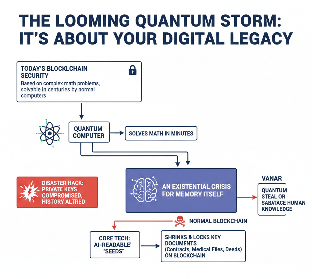 Its core tech shrinks key documents—a legal contract, a medical file, a deed—to tiny, AI-readable "Seeds" that are locked away in perpetuity on the blockchain. But if a quantum computer were to get in, it wouldn't be looking to steal coins; it could steal or sabotage that bedrock of human knowledge that we trust. Vanar is future-proofing not only money but our digital proof and history.