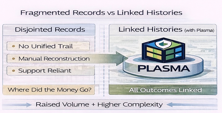 Menurut dokumentasi resmi Plasma dan penjelasan publik, salah satu kelemahan struktural di banyak sistem pembayaran adalah cara riwayat transaksi disimpan. Pembayaran, pengembalian dana, penyesuaian, dan penyelesaian akhir sering kali dicatat sebagai peristiwa terpisah tanpa tautan yang permanen di antara mereka. Pada volume rendah, ini terasa dapat dikelola. Pada skala besar, ini menciptakan titik buta yang memperlambat pengambilan keputusan dan meningkatkan risiko operasional.