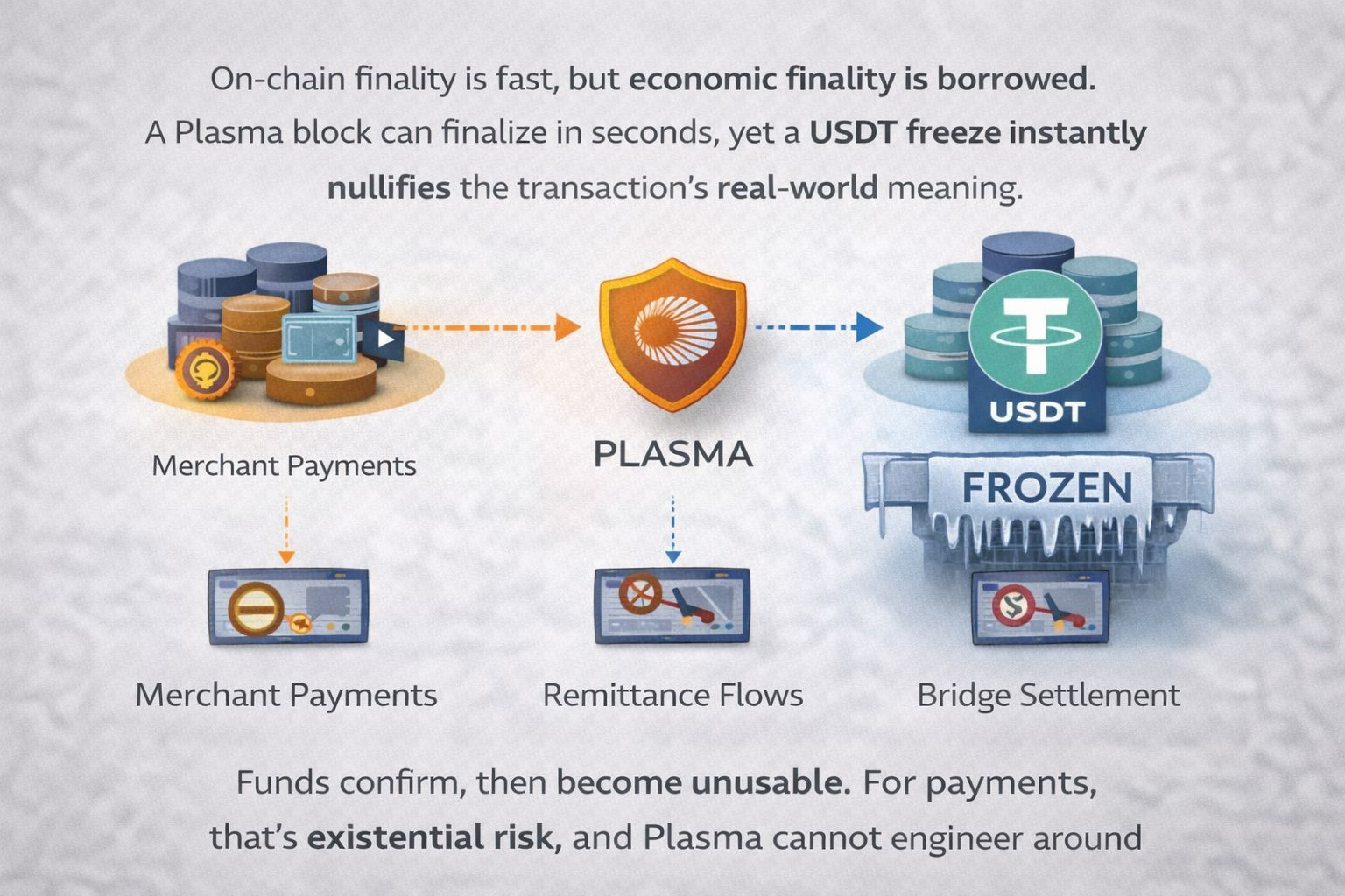 On-chain finality is fast, but economic finality is borrowed. A @Plasma block can finalize in seconds, yet a USDT freeze instantly nullifies the transaction’s real-world meaning. From a payment perspective, that’s worse than congestion or high fees. It’s silent failure: funds appear confirmed but become unusable. For merchants and remittance flows, that risk is existential, not theoretical. Any bridge or settlement path involving USDT inherits the same enforcement surface, and Plasma cannot engineer around it — only accept it.