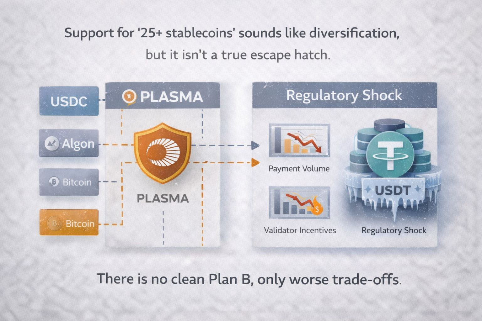 Support for “25+ stablecoins” sounds like diversification, but it isn’t a true escape hatch. USDC carries similar blacklist risk, algorithmic stables reintroduce fragility under stress, and Bitcoin settlement breaks the low-friction UX Plasma is designed for. If USDT were to face a serious regulatory shock, payment volume would fall first, validator incentives would weaken next, fee burn would stop offsetting inflation, and the network’s security budget would tighten. There is no clean Plan B, only worse trade-offs.