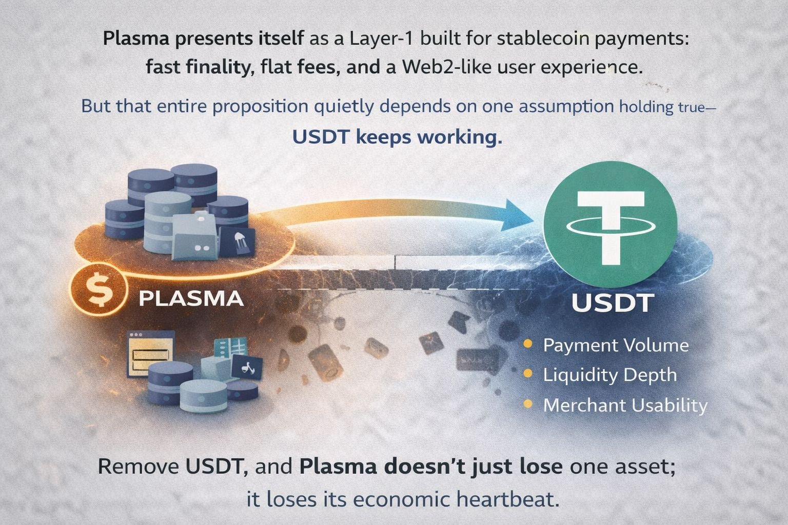 Plasma presents itself as a Layer-1 built for stablecoin payments: fast finality, flat fees, and a Web2-like user experience. But that entire proposition quietly depends on one assumption holding true — USDT keeps working. In practice, Plasma’s payment volume, liquidity depth, and merchant usability are all tightly coupled to Tether. Remove USDT, and Plasma doesn’t just lose one asset; it loses its economic heartbeat. That doesn’t make Plasma “bad,” but it does change what it really is.