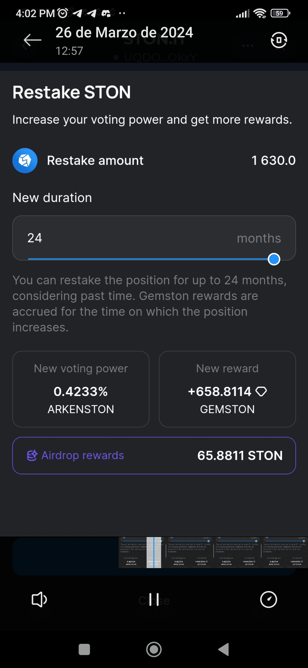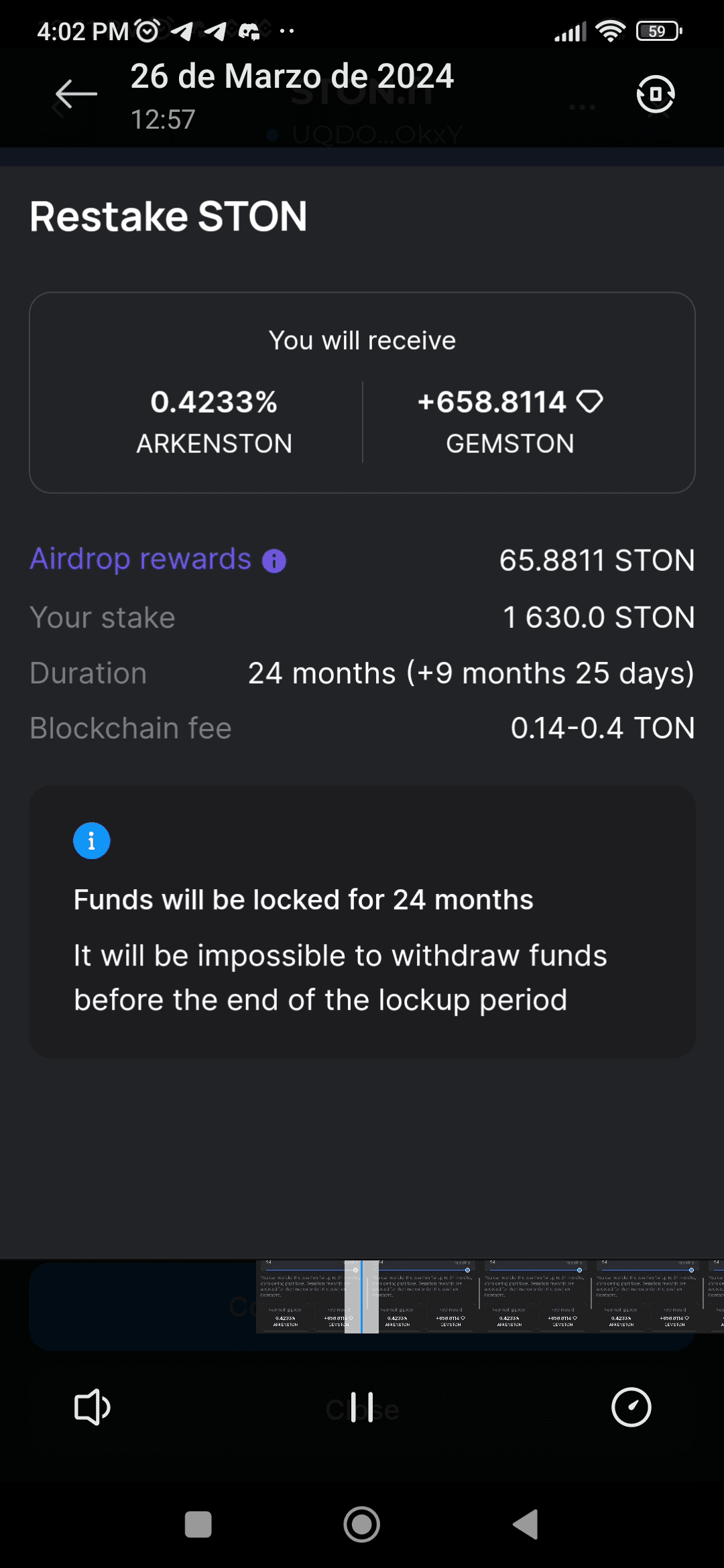 Sudah setahun saya staking STON yang akan dilepas sesuai kontrak pada tahun 2025 (2 tahun). Kejutannya saya ketika melakukan Restaking untuk jangka waktu 2 tahun saya kira akan ditambah 2 tahun lagi dan Tokennya akan dirilis pada tahun 2027, namun bukan tokennya yang akan dirilis pada tahun 2026, yaitu, hanya satu tahun setelah apa yang ditetapkan dalam kontrak saya sebelumnya! ๐