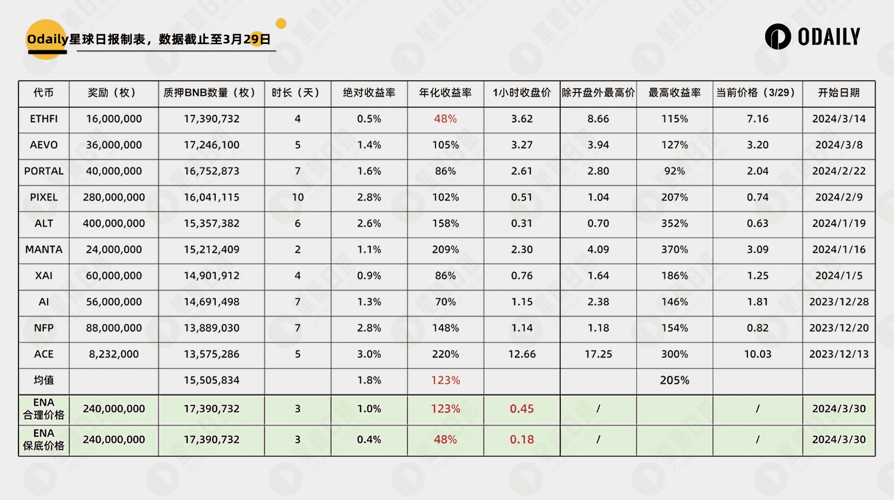 Menurut statistik dari Planet Daily, berdasarkan kumpulan penambangan BNB, rata-rata pengembalian tahunan Binance Lanchpool dalam 10 periode pertama adalah 123%. Dengan asumsi pengembalian tahunan penambangan ini juga 123%, berdasarkan 3 hari penambangan, harga $ENA kira-kira 0,45U.