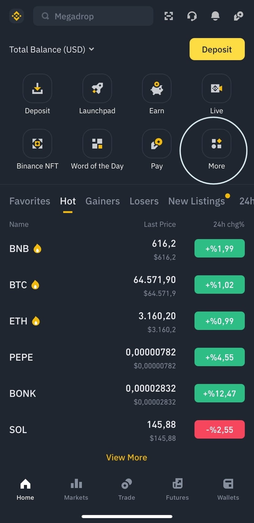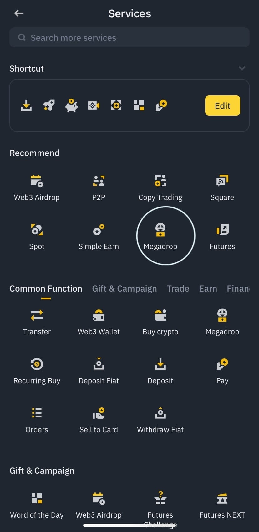 1- Klik di tempat yang tertulis lebih banyak di aplikasi seluler Binance. Mengetik Megadrop di kotak pencarian adalah metode lain untuk mencapainya.