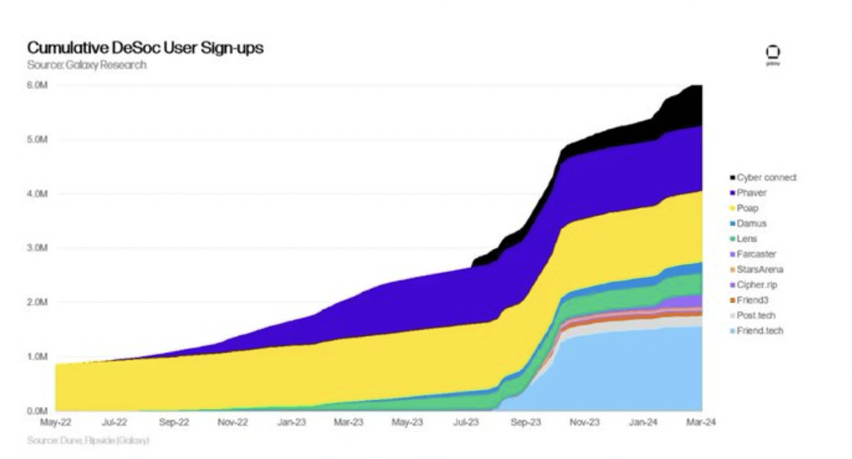 Menurut Galaxy Research, SocialFi telah menarik lebih dari 8.7 juta pengguna, memiliki sekitar 550,000 pengguna aktif, dan memproses 82 juta transaksi lintas platform seperti Ethereum, Optimism, dan BSC.