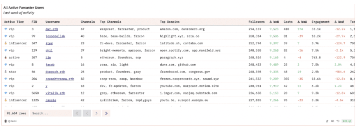 Panel data Farcaster Explorer memberi peringkat pada pengguna Farcaster berdasarkan jumlah pengikut, jumlah tweet, dan keterlibatan (poin yang diterima tweet).