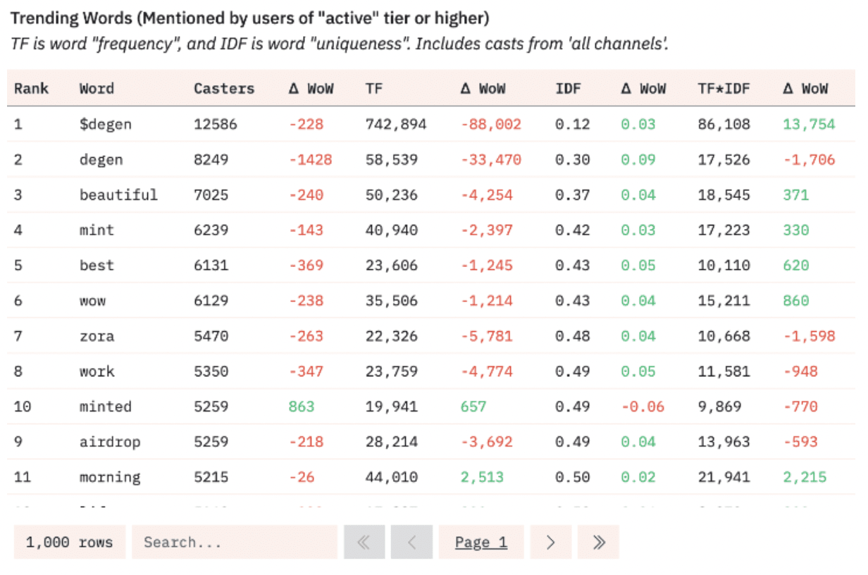 Misalnya saja dari data terlihat bahwa topik terhangat saat ini di Farcaster adalah $degen, yang telah disebutkan oleh lebih dari 20.000 pengguna dan muncul di tweet lebih dari 800.000 kali. Pengguna juga dapat memasukkan saluran (saluran) tertentu untuk disaring melalui "filter saluran kata" untuk menemukan kata kunci paling populer di saluran tersebut.