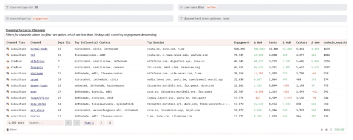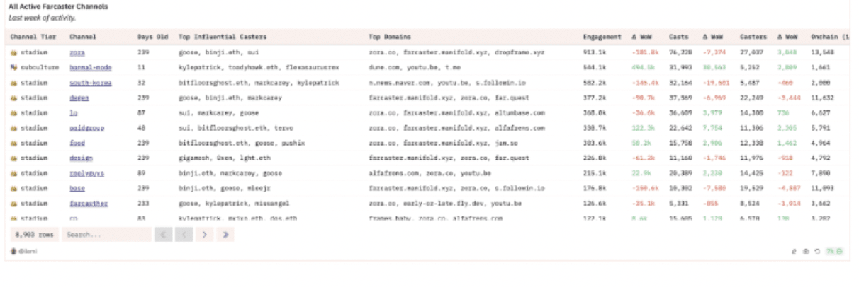 Melalui dasbor data, Anda dapat melihat saluran paling aktif di Farcaster yang diurutkan berdasarkan skor keterlibatan, membantu dengan cepat mengidentifikasi saluran yang harus difokuskan terlebih dahulu.