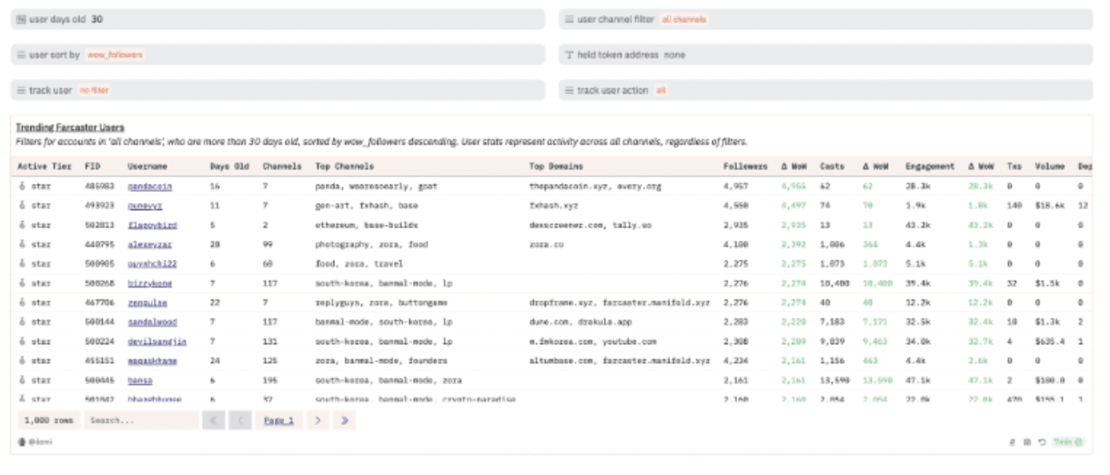 Pengguna juga dapat memfilter pengguna berdasarkan kriteria tertentu untuk analisis lebih mendalam. Misalnya, melihat pengguna yang telah terdaftar selama lebih dari 30 hari di semua saluran, diurutkan berdasarkan jumlah pengikut dalam urutan menurun, atau melihat pengguna yang diikuti oleh pengguna tertentu seperti @jessepollak (Pemimpin protokol dasar) dan telah terdaftar kurang dari 7 hari, diurutkan berdasarkan keterlibatan dalam urutan menurun.